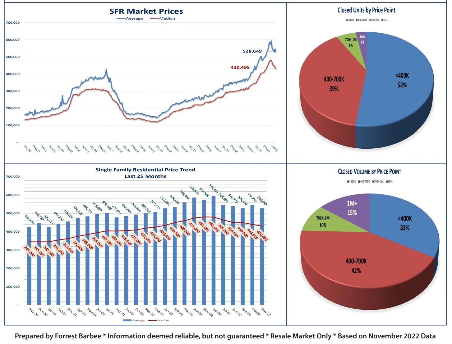 The median sales price of SFR closings dipped from $440,000 to $430,495 while the SFR average closed sales price fell to $528,649 for a decrease of 3.3%. The luxury market closings slipped to 71 in November and it’s now likely that 2022 luxury closings will end up slightly behind 2021. The last chart below really shows the shift in sales by price point.